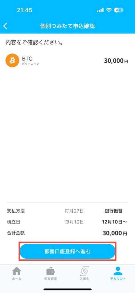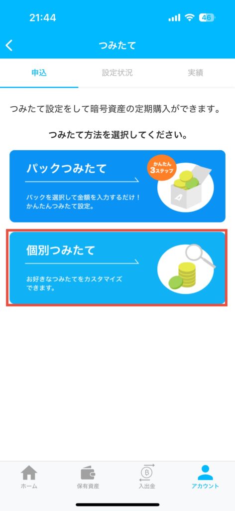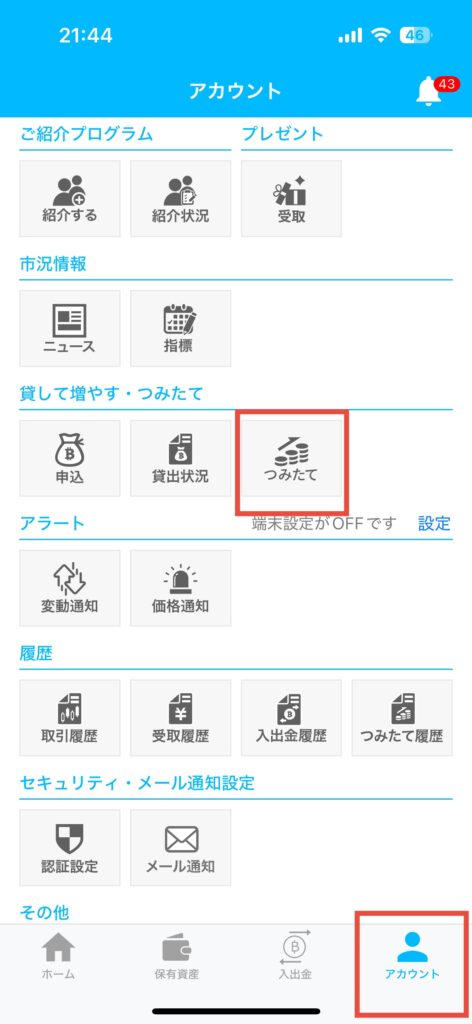 最後につみたて設定です。アカウント画面より「つみたて」を選択。