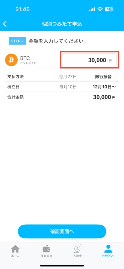 金額設定画面。金額を入力します。最低金額は5,000円〜可能。