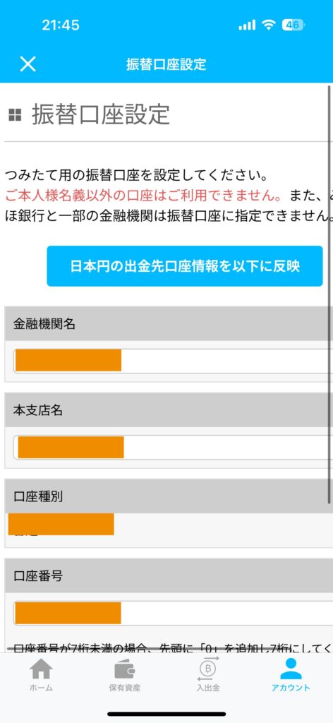 引き落とし口座の設定。金融機関・支店・口座種別・口座番号を入力。