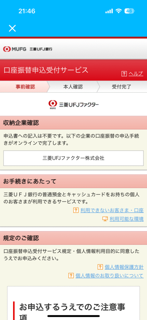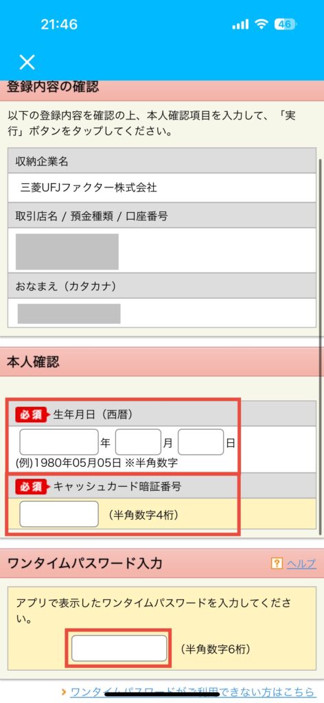 引き落とし口座の本人確認。生年月日と暗証番号を入力。