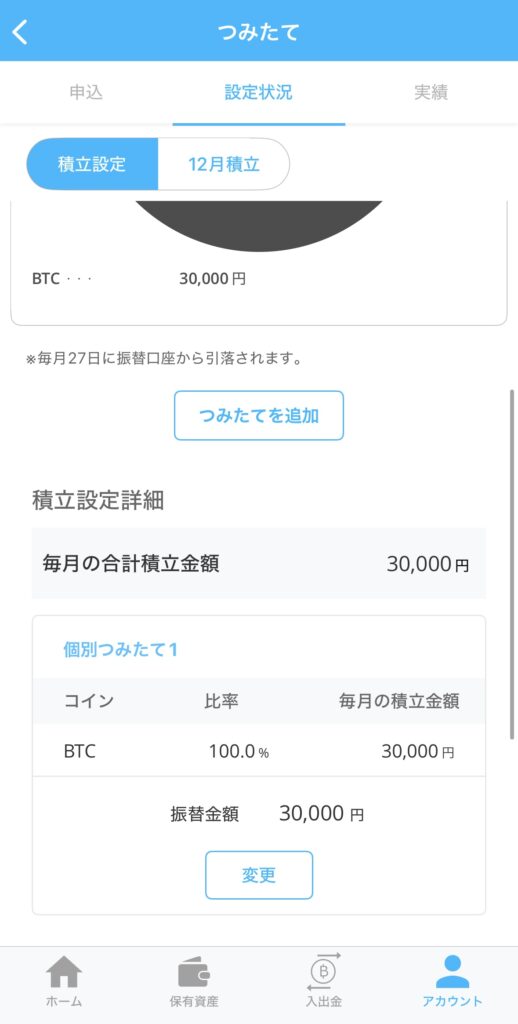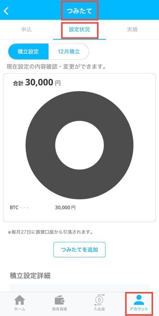 つみたて状況の確認はアカウント→つみたて→設定状況で確認できます。