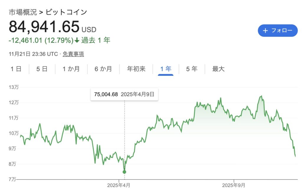 年間チャートだと4月に大きな下落をしてから上昇傾向にありましたが一旦85,000ドル程度まで下がりました。世界の企業がビットコインを準備金や政府の資産とするなどビットコインに対する大きな動きがあります。