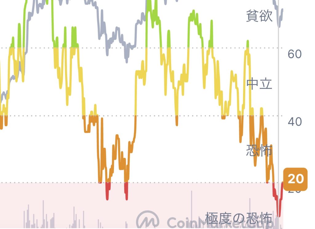 4月に20を切る恐怖指数がありましたが株価と仮想通貨の暴落を受けて投資家心理は先週年内では最大の恐怖を記録。