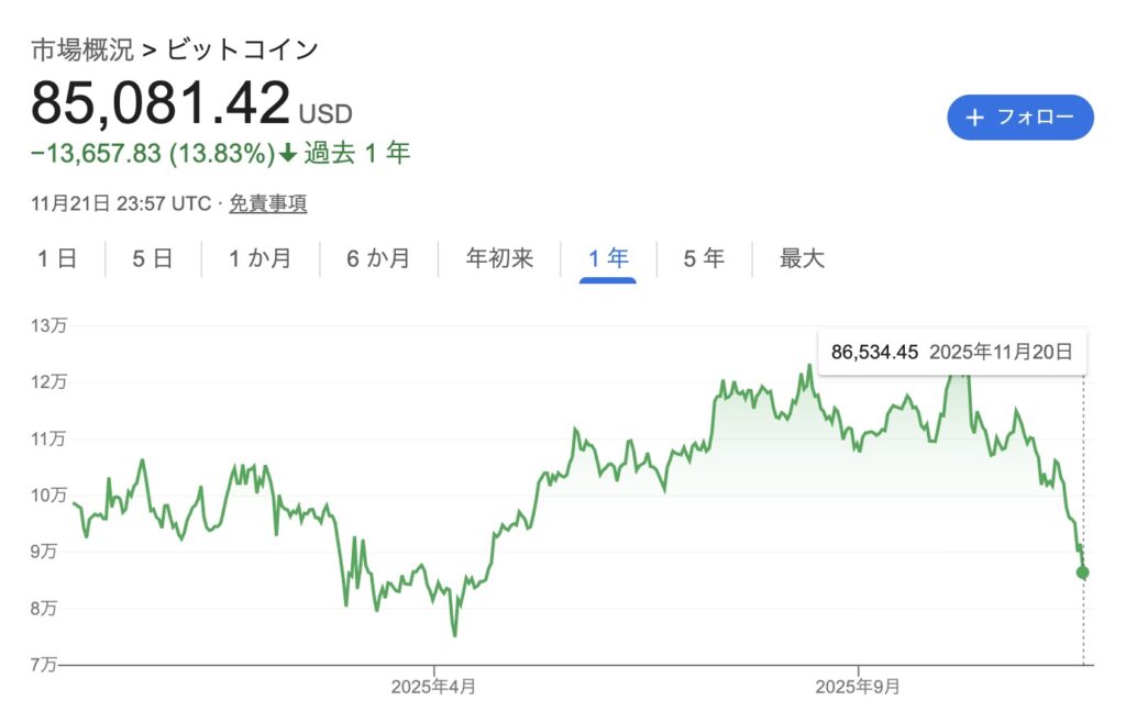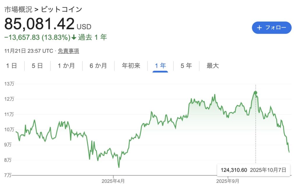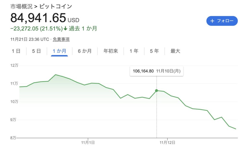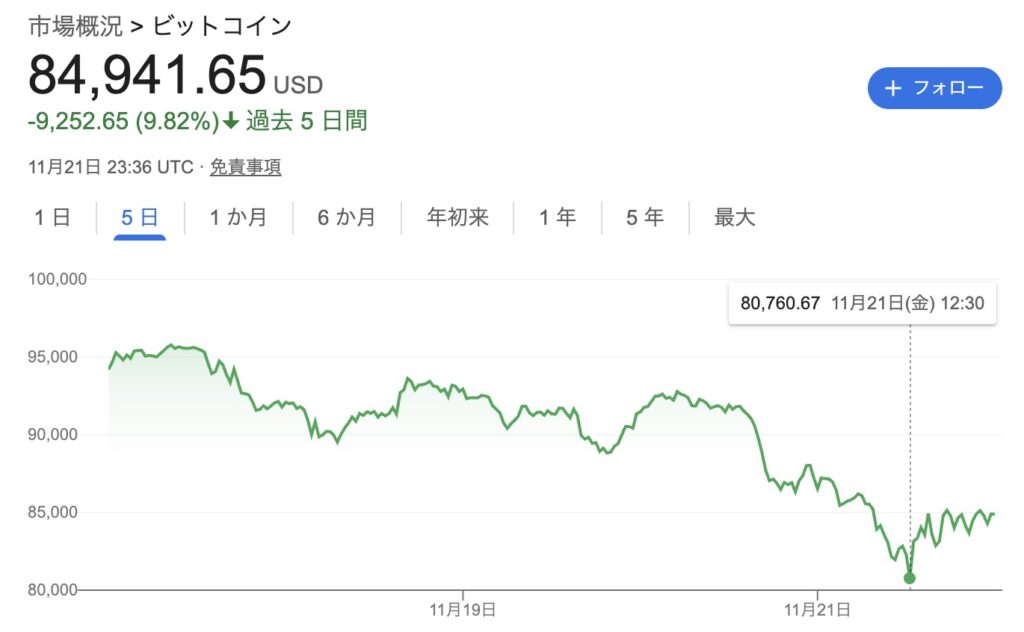 10月には123,000ドルまで急騰しましたがその後85,000ドルまで下がり約30%の下落になりました。コロナショックに次ぐ最大規模の下落です。