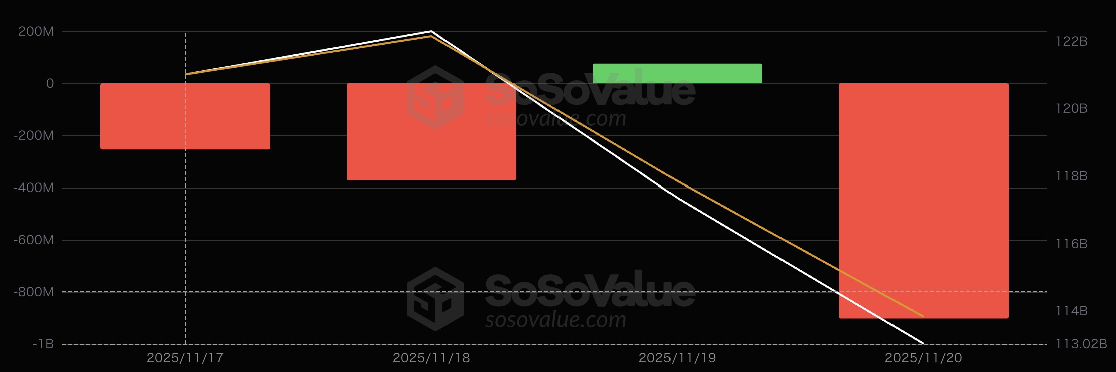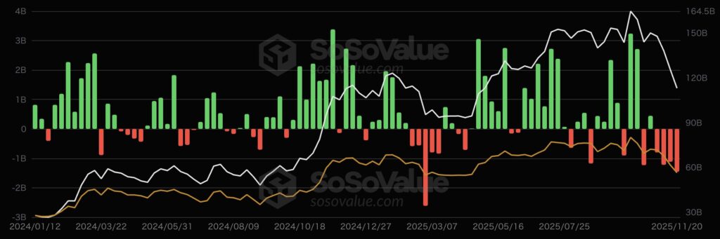 市場全体が小休止モード。ビットコイン主導で軽い下落だが、構造的な崩れではない。今後の注目点は ビットコインETFの資金流入動向 と 11月後半の米経済指標。