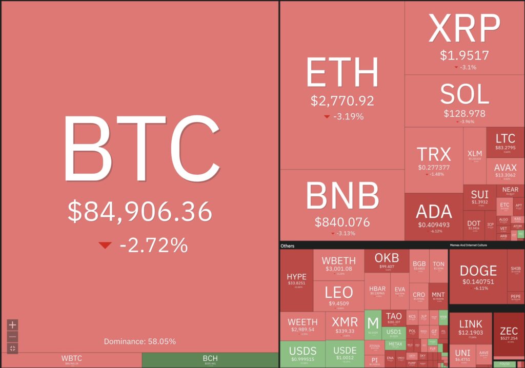 市場の中心であるビットコインが下落しており、ドミナンス(市場占有率)は58.5%。
