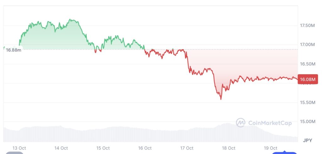 10月18日付で報じられたところによると、ビットコインは直近の高値から約15.4%下落し、株式市場での1929年の大暴落時(ダウ平均12.8%の下落)を上回るペースだったといわれています。
