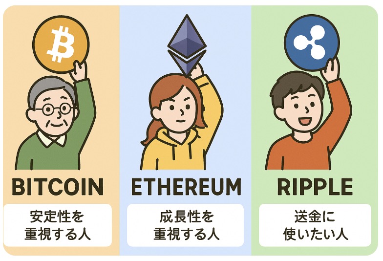 初心者の方には、まず「ビットコイン」から始めるのが無難です。理由は、情報が多く、対応している取引所やウォレットも豊富であるためです。また、値動きも比較的安定しており、長期保有に向いています。認知度No.1と取引量も圧倒的No.1ですね!イーサリアムは、NFTや新技術に興味がある人におすすめ。リップルは送金スピードを重視したい人や短期トレードに向いているかもしれません。口座開設はコインチェックが初心者に優しくかんたんに操作できるのでおすすめですよ😄