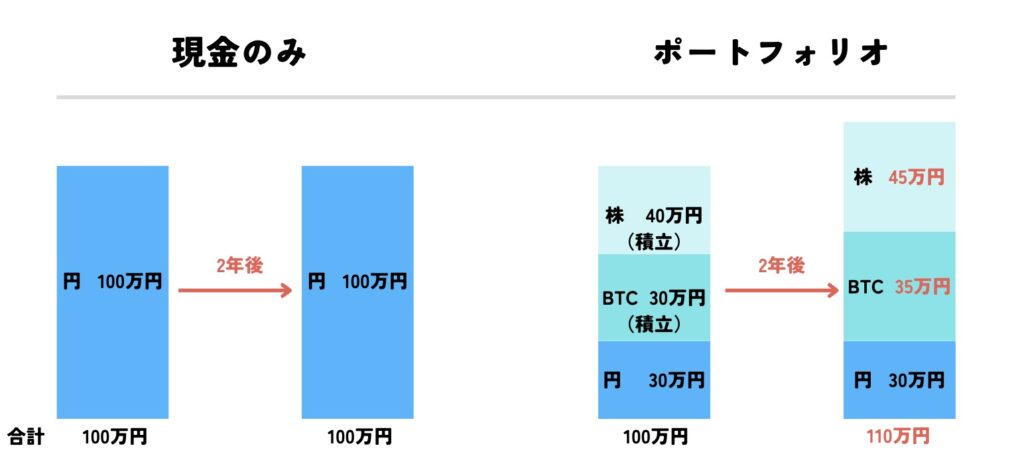 上の図を見ると円で100万円保有しているよりもポートフォリオを組んでビットコインと株を保有している時の方が10万円高くなっています。これが5年/10年となった時に差はもっと開いているでしょう。それだけポートフォリオは大事なのです。