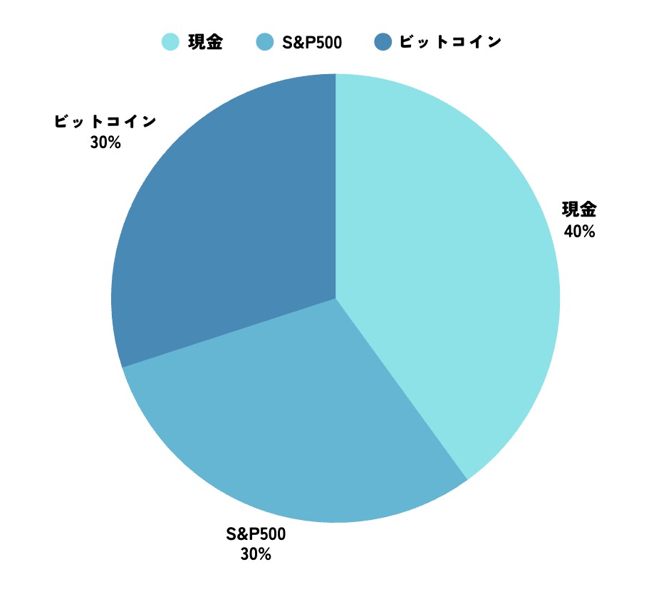 現金は40%・S&P500は30%・ビットコインは30%で分散投資をしながら、S&P500とビットコインで資産を構築する設計です。S&P500とビットコインは積立ドルコスト平均法を使うことでリスクを減らしながら安全に資産を増やすことができます。これを預金で当てはめてみましょう。