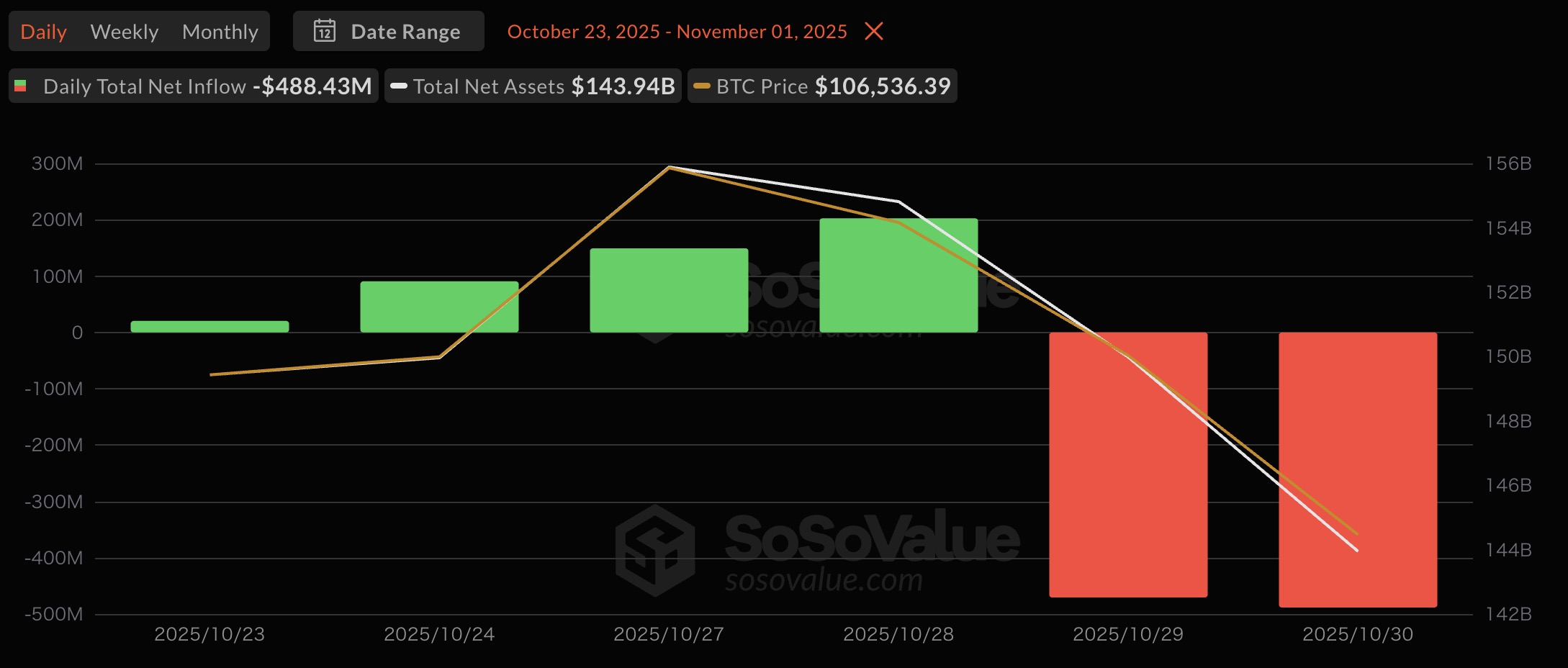上の図はETFへの資金の入り方をグラフで示したものになります。緑が流入、赤が流出。週間だと29日から資金が流出しています。