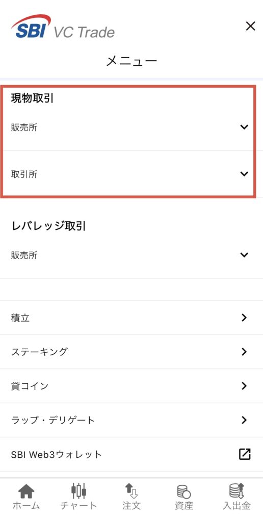 取引所の多くは販売所と取引があります。👇はSBI VC Tradeのアプリですが、見てもらう通りにアプリの中に現物取引として販売所と取引所があります。その違いを↓で説明していきます。
