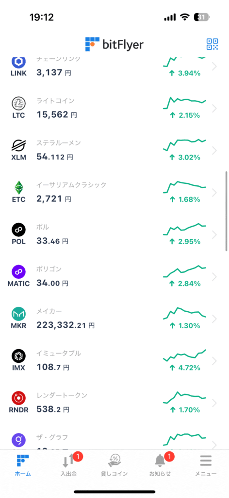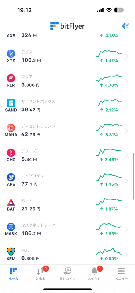 bitFlyer(ビットフライヤー)は国内取引所の中でも取扱銘柄が豊富です。ビットコイン、イーサリアムはもちろんアルトコインまでありますので選択肢は広がりますね。