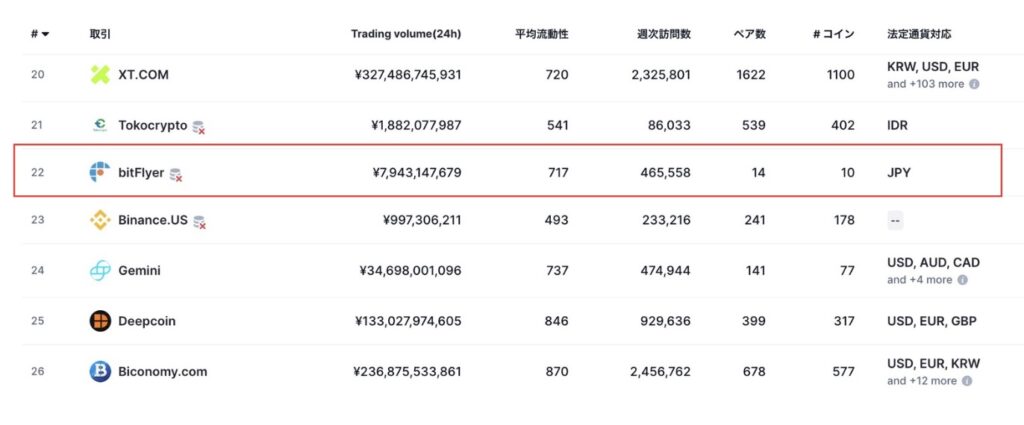 こちらは25年9月末に見た世界の24時間取引量になりますが、世界で見ても24位にランクインしています。国内ではコインチェックなどが有名ですが、コインチェックは50位でした。