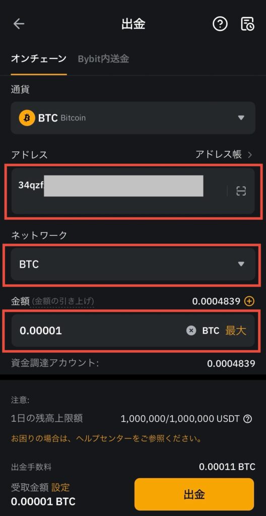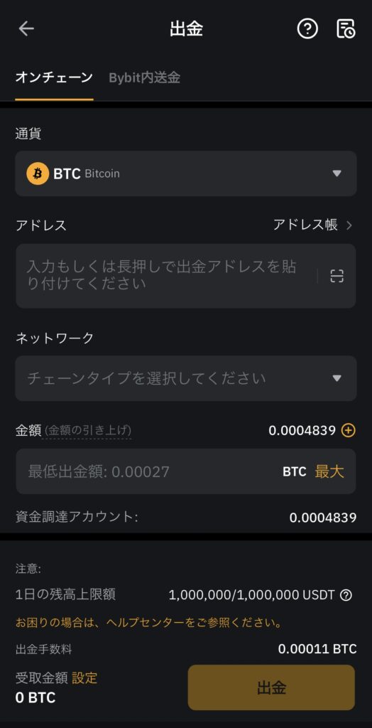 送金先でビットコインをbitFlyer取引所に送ります。今回はByBitを利用。