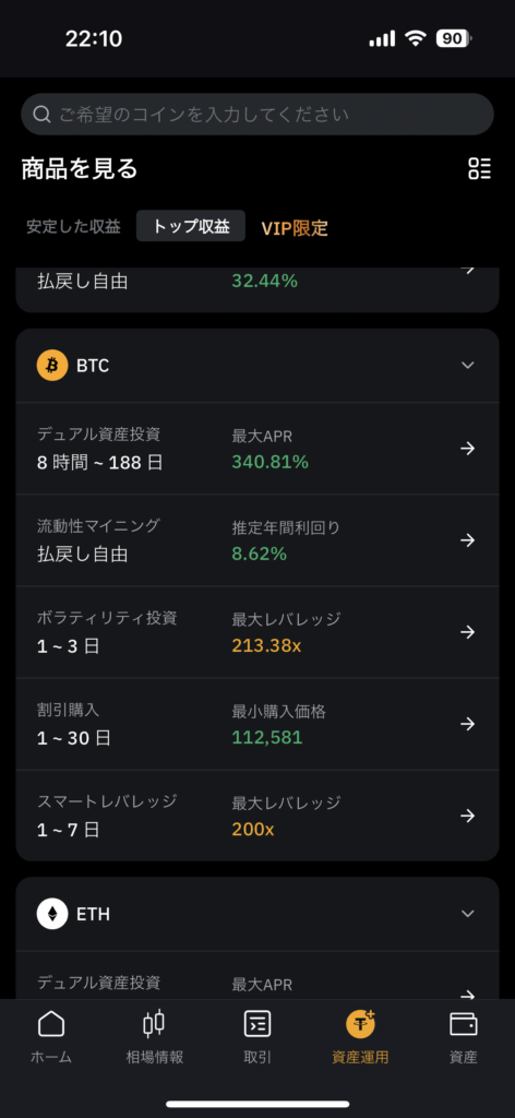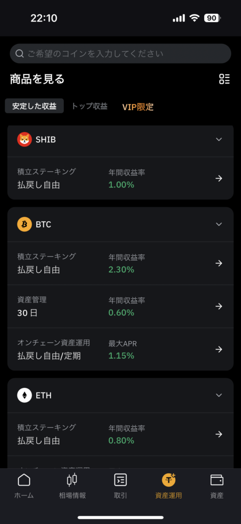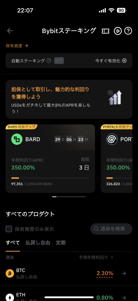 Bybit(バイビット)は預けて資産を増やすDeFi運用関連のサービスが多彩です。主にステーキングやレンディングといったサービスが魅力で、国内では取扱が少ないビットコインのステーキングサービスにも対応しています。