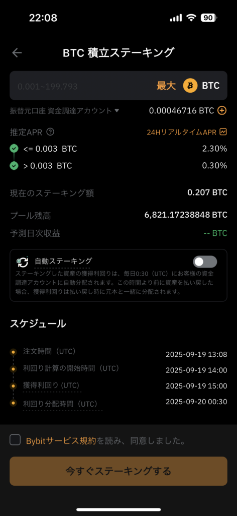 私も実際にByBit(バイビット)にビットコインを預けてステーキングサービスを利用しています。金額も日本語表記に変換してくれているので非常に分かりやすいですよ。