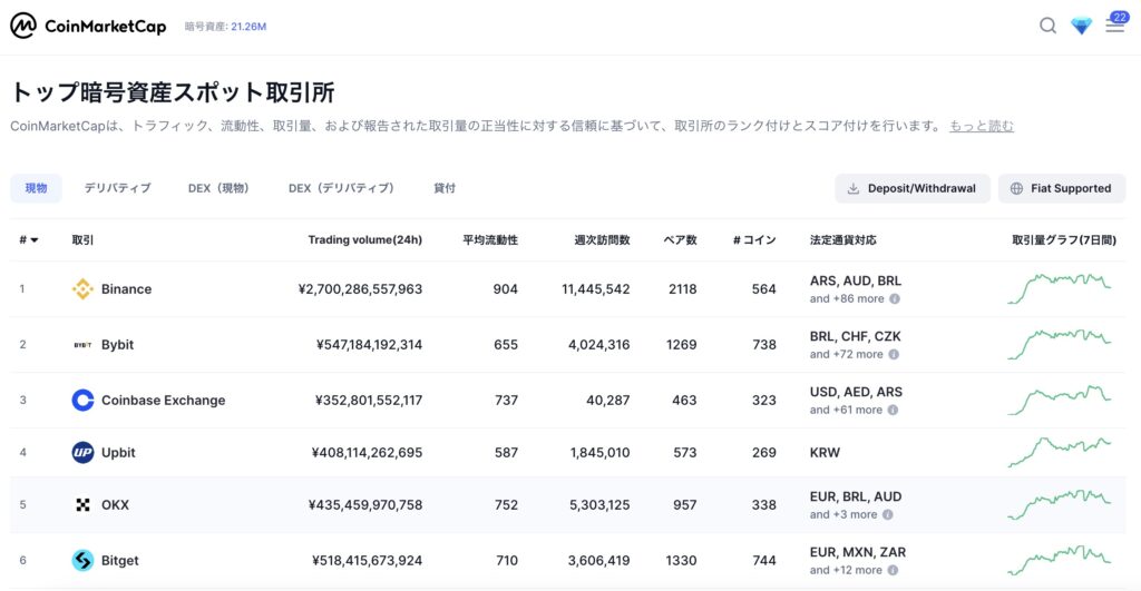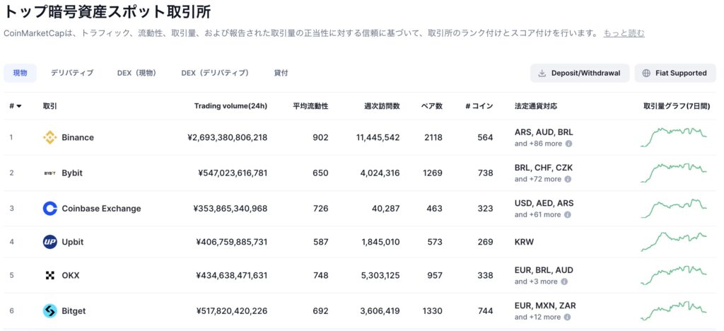 25年9月時点では全世界でも2位と高く、流動性が高ければ高いほどスプレッドが安く仮想通貨の売買手数料の安さに影響します。